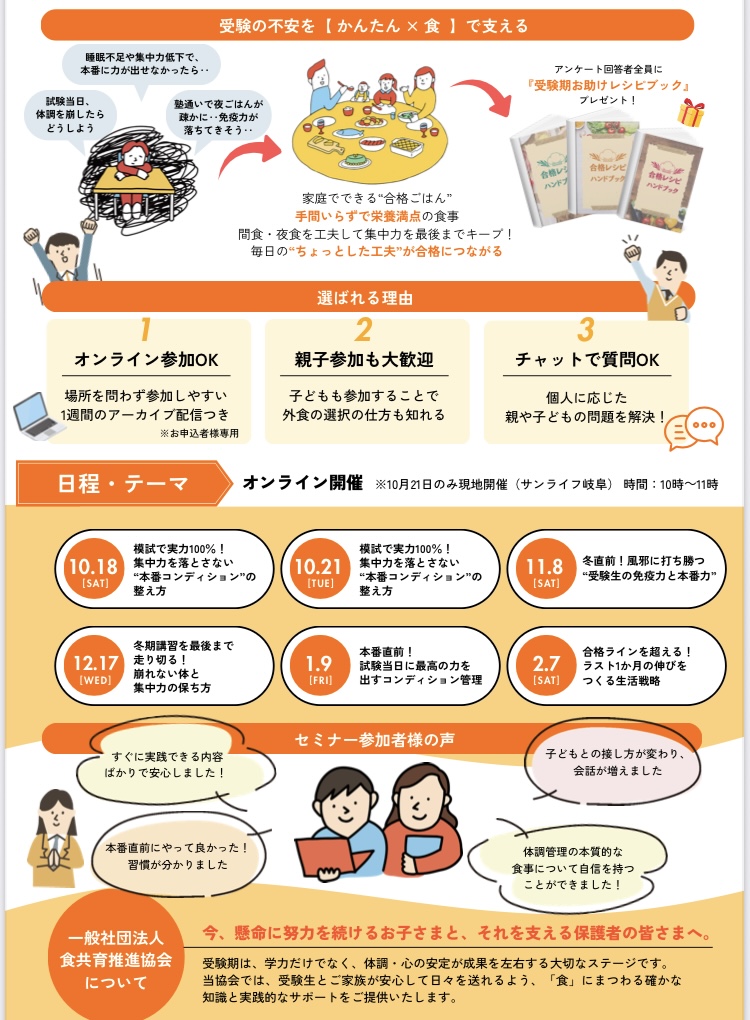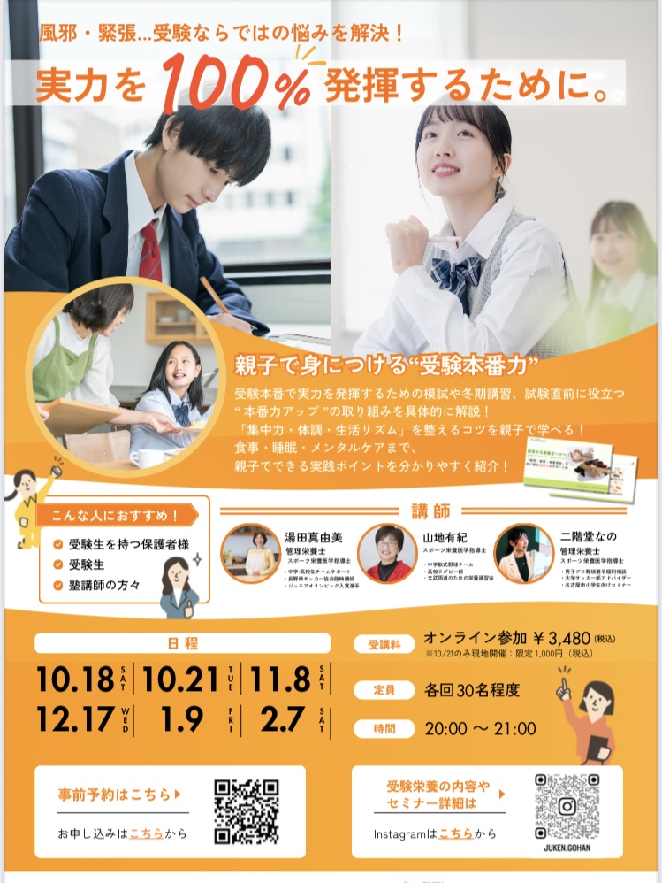 • 受験栄養の基本を押さえ、試験期に向けた準備を安心して進められます。