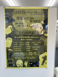中学生は10月は定期テストのある学校も少ないため、11月の定期テストに向けて早くから動き出すことで点数アップにつなげていきたいと考え、ハロウィン自習イベントを開催します!!