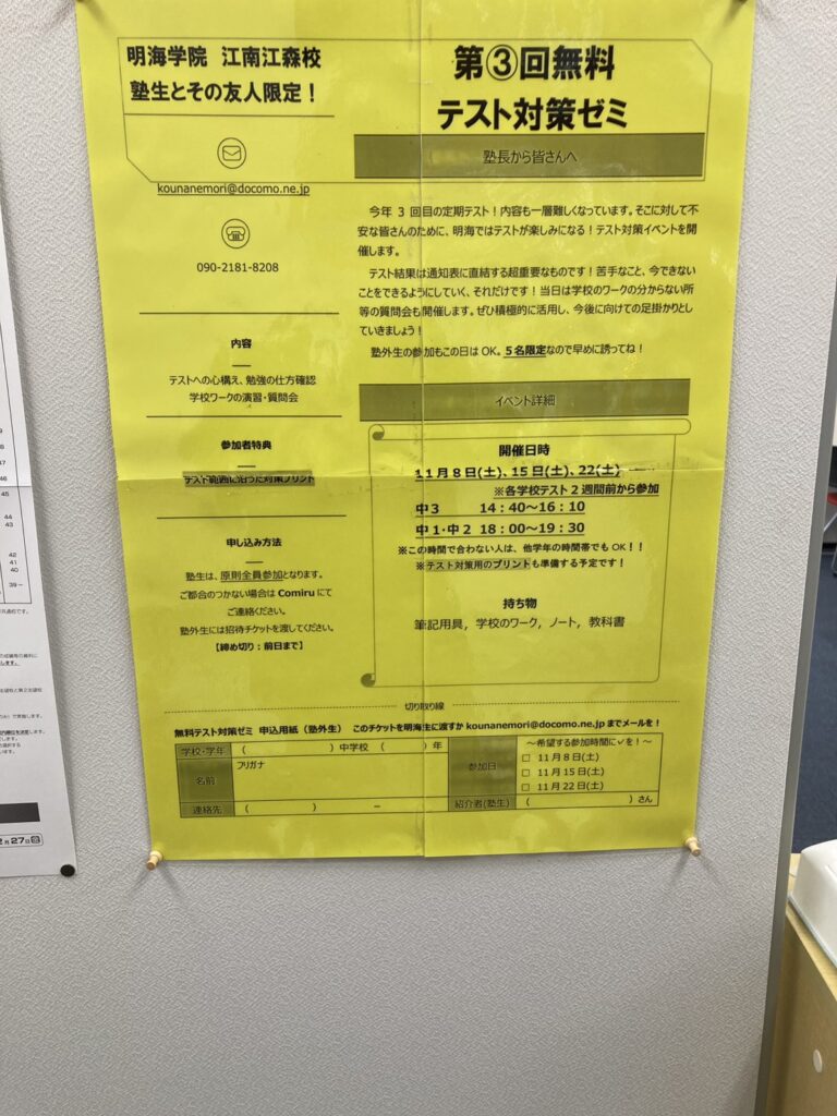 第3回定期テスト対策ゼミのお知らせ!【北部中、古知野中、大口中、扶桑中、扶桑北中学区の個別指導塾 明海学院 江南江森校】