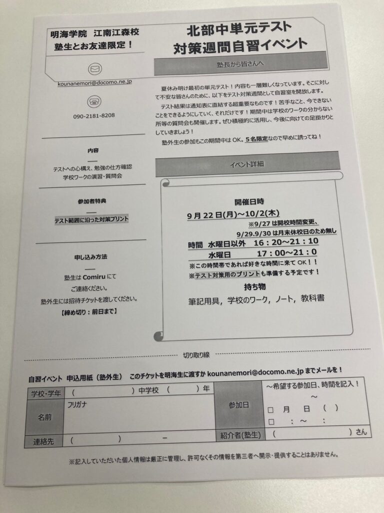 北部中単元テスト対策自習イベント開催のお知らせ!【北部中、古知野中、大口中、扶桑中、扶桑北中学区の個別指導塾 明海学院 江南江森校】