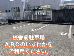 説明会に車でお越しの方は、校舎前駐車場のA,B,Cのいずれかをご利用ください。