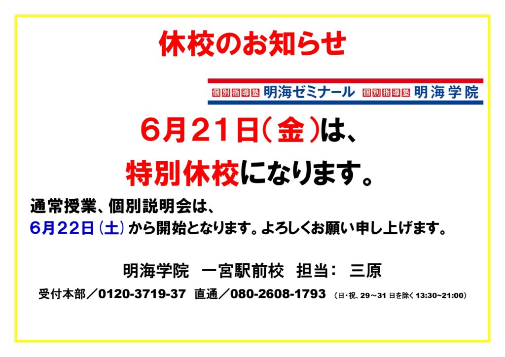 こんにちは。 明海学院一宮駅前校 塾長の三原です。 明日6/21(金)は特別休校となります。 個別説明会や体験授業は6/22(土)以降でのご案内となります。 休校日もWebからのお問い合わせは […]