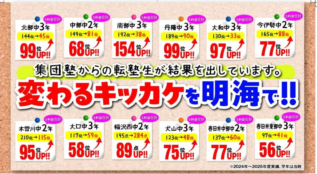 こんばんは。 明海学院一宮駅前校、塾長の丹羽です。 お盆休みはどうでしたか? まだ暑い日が続きますが、水分補給はしっかりとしましょう! 秋のチラシができました。 一宮駅前校の実績も掲載しており […]