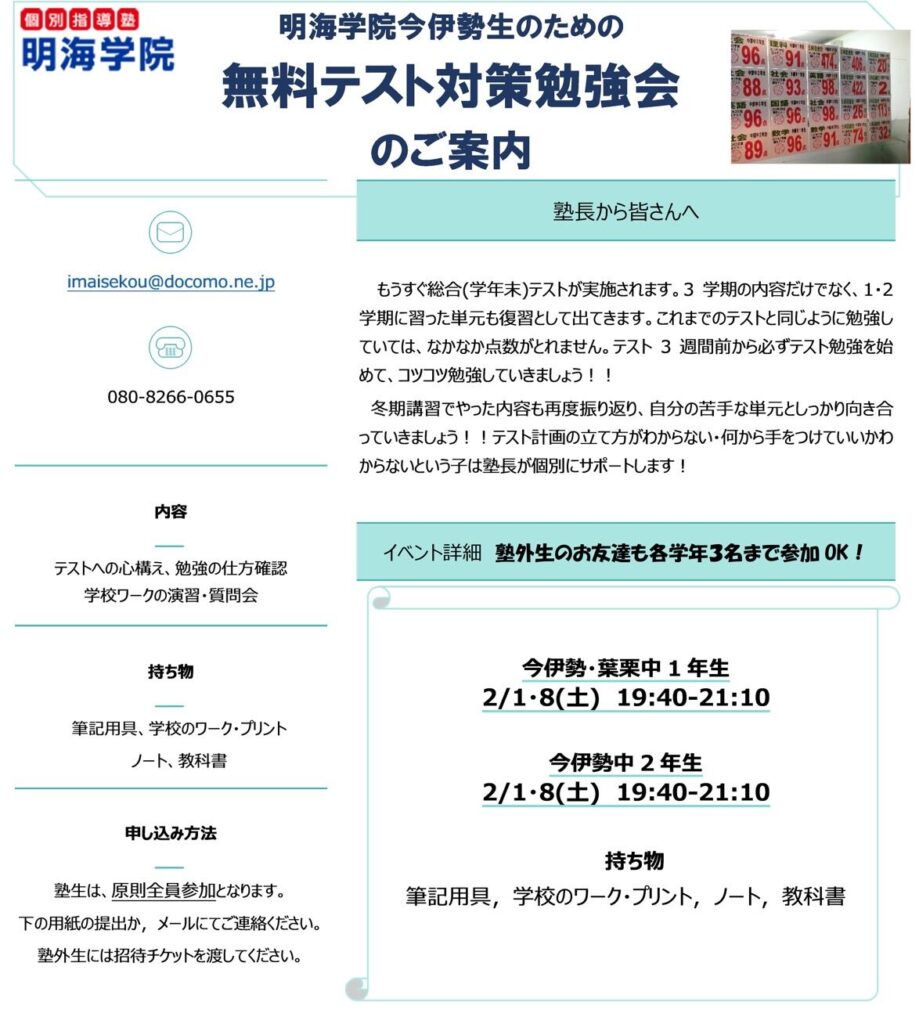 【中1.2】📒今日から3学期総合(学年末)テスト対策スタート!!📒【一宮市 今伊勢中 北部中 葉栗中 奥中 尾西三中学区の個別指導塾 明海学院 一宮今伊勢校】