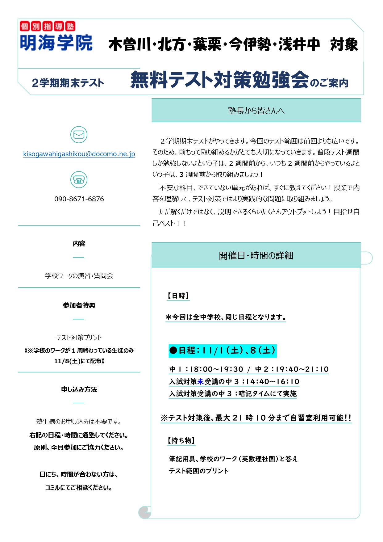11/1~テスト勉強スタート!!【中学生】11/1.8(土)無料テスト対策勉強会🍂【木曽川中・葉栗中・北方中・今伊勢中の個別指導塾 明海学院 一宮木曽川東校】