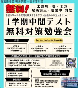 【イベント開催】1学期中間テスト無料対策勉強会【木曽川中・北方中・奥中・木曽川西小・黒田小・北方小・奥小エリアの個別指導塾 明海学院 一宮木曽川校】