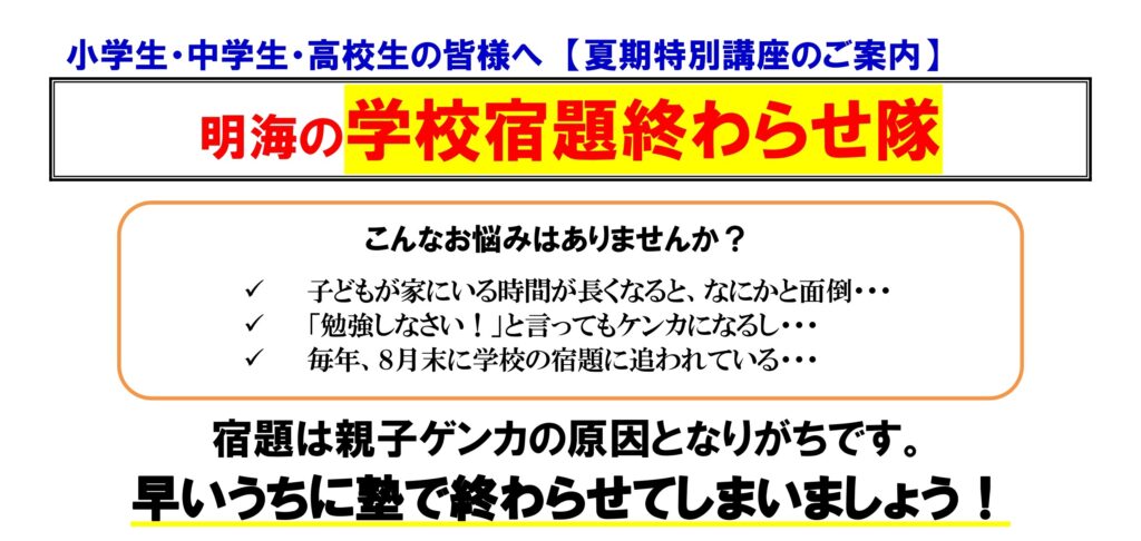 《夏期特別講座》学校宿題終わらせ隊!【木曽川中・北方中・奥中・木曽川西小・黒田小・北方小・奥小エリアの個別指導塾 明海学院 一宮木曽川校】