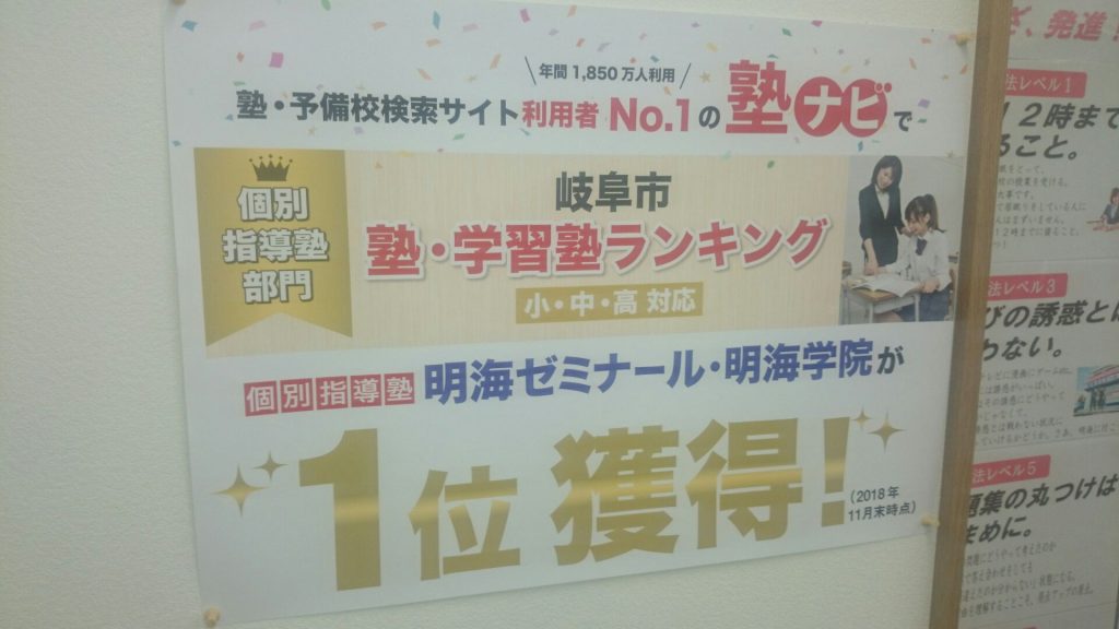 こんにちは。長良校の石井です。 先日、塾・予備校検索サイト利用者No,1の塾ナビの個別指導塾部門に おきまして岐阜市の塾・学習塾ランキングでなんと明海ゼミナールが 1位を獲得しました。 &nb […]