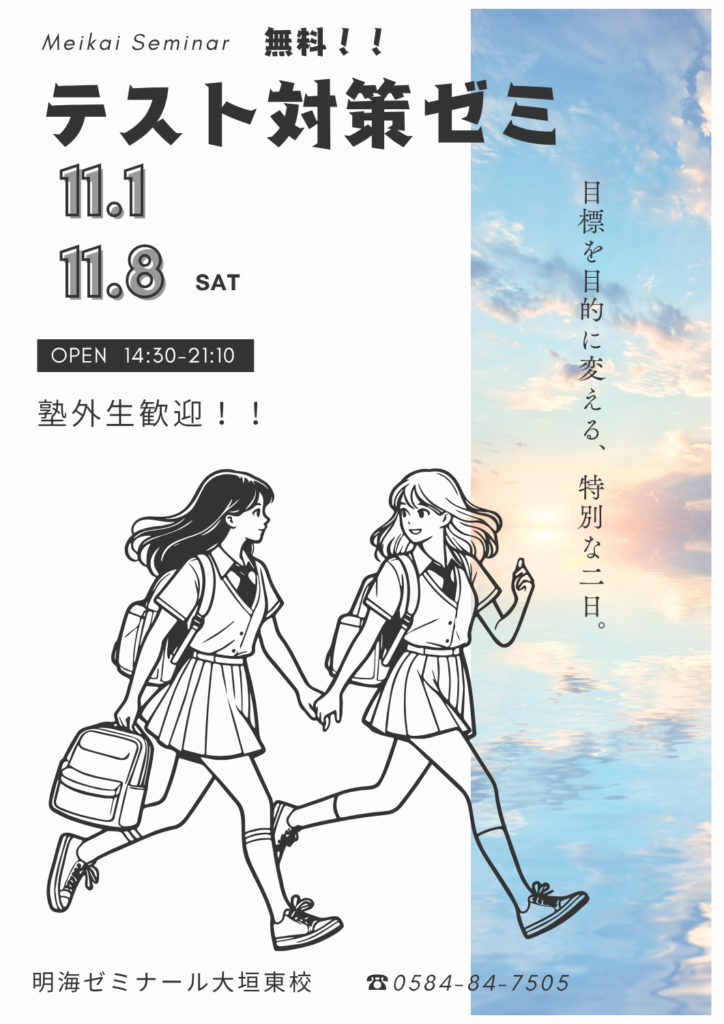 2025年10月28日 【塾外生も参加可】無料テスト対策ゼミを開催します!!【大垣市・安八町 / 東中 東安中 登龍中 江並中 星和中学区の個別指導塾 明海ゼミナール 大垣東校】 大垣市・安八町の皆様へ 大垣市・安八町の皆様へ こんにちは。明海ゼミナール 大垣東校の安藤です! 気づけばもうすぐ11月! この時期の寒暖差にやられて体調を崩す子も出てきているので、 体調管理しっかりと気を付けていきましょう💪 無 […] カテゴリー: 中1生 中2生 中3生 勉強のコツ 各学年 大垣東校のテスト結果 教室からのお知らせ 教室での指導 星和中 未分類 東中 東安中 登龍中 高校入試