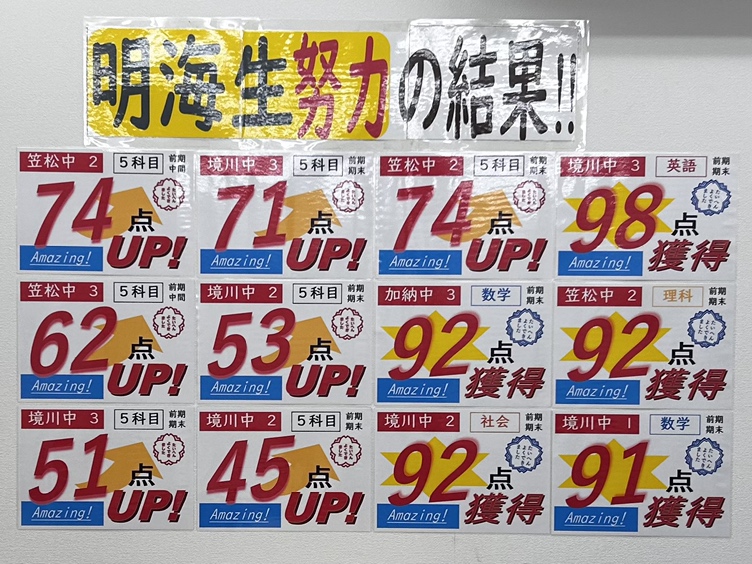 点数アップを掲示しました!!【岐阜市・笠松町 / 境川中・笠松中・加納中学区の個別指導塾 明海ゼミナール 柳津校】